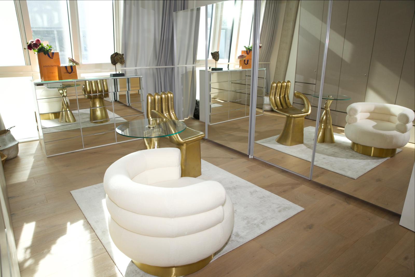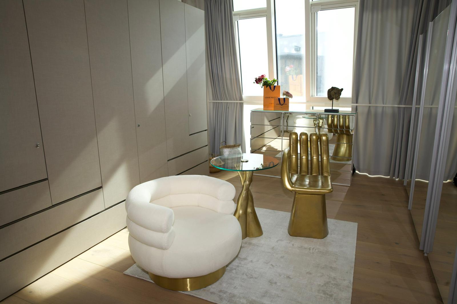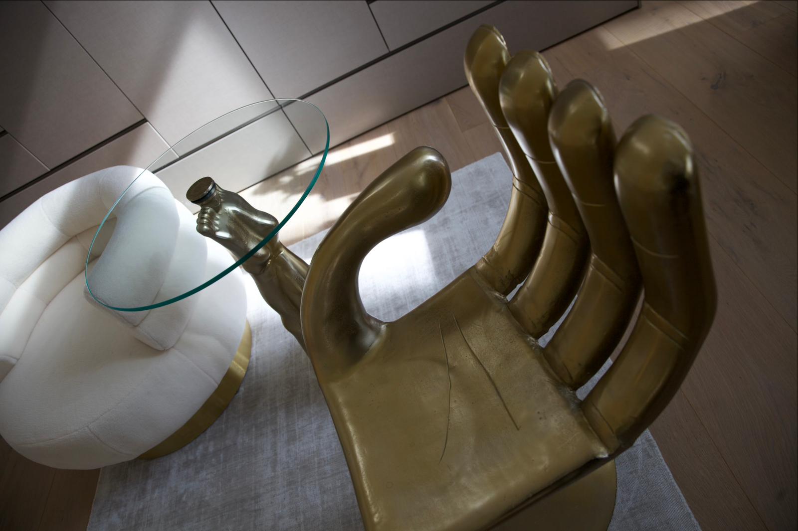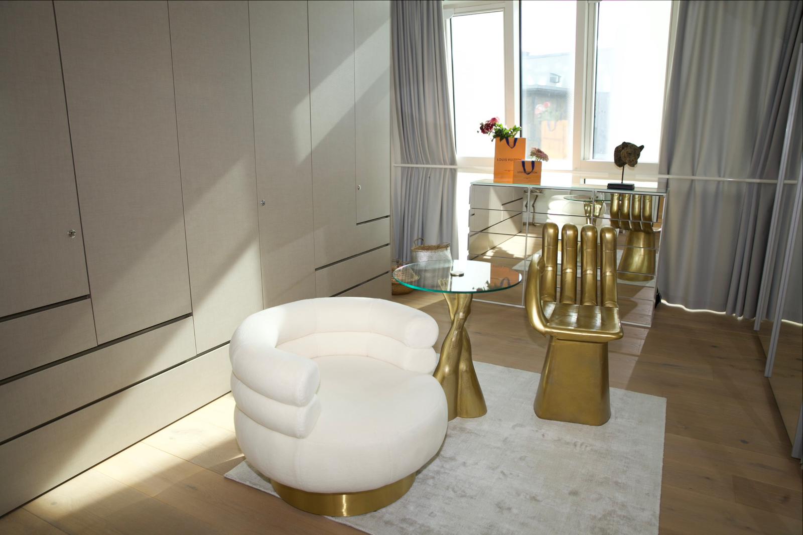 Büyük salon, özellikle misafir ağırlamak için tasarlandı; koltuğa her taraftan erişim sağlanabiliyor ve özel üretim halı, futbolcunun ayak izlerini