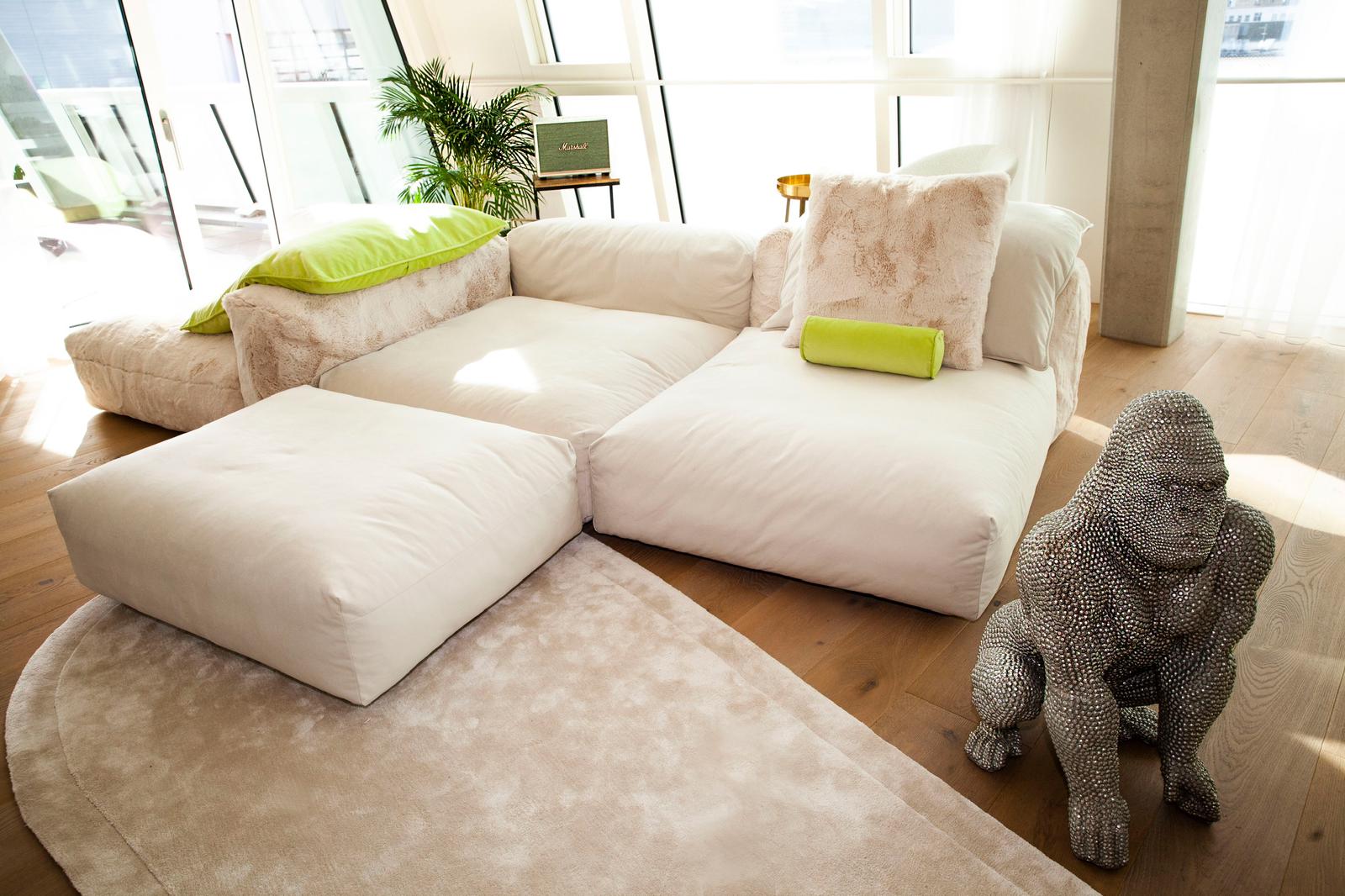 Koltuklar modüler olarak tasarlandı; her parçası yaklaşık 1 m² büyüklüğünde, sade ama lime renk detaylarıyla çarpıcı bir etki yaratıyor. Ayrıca özel