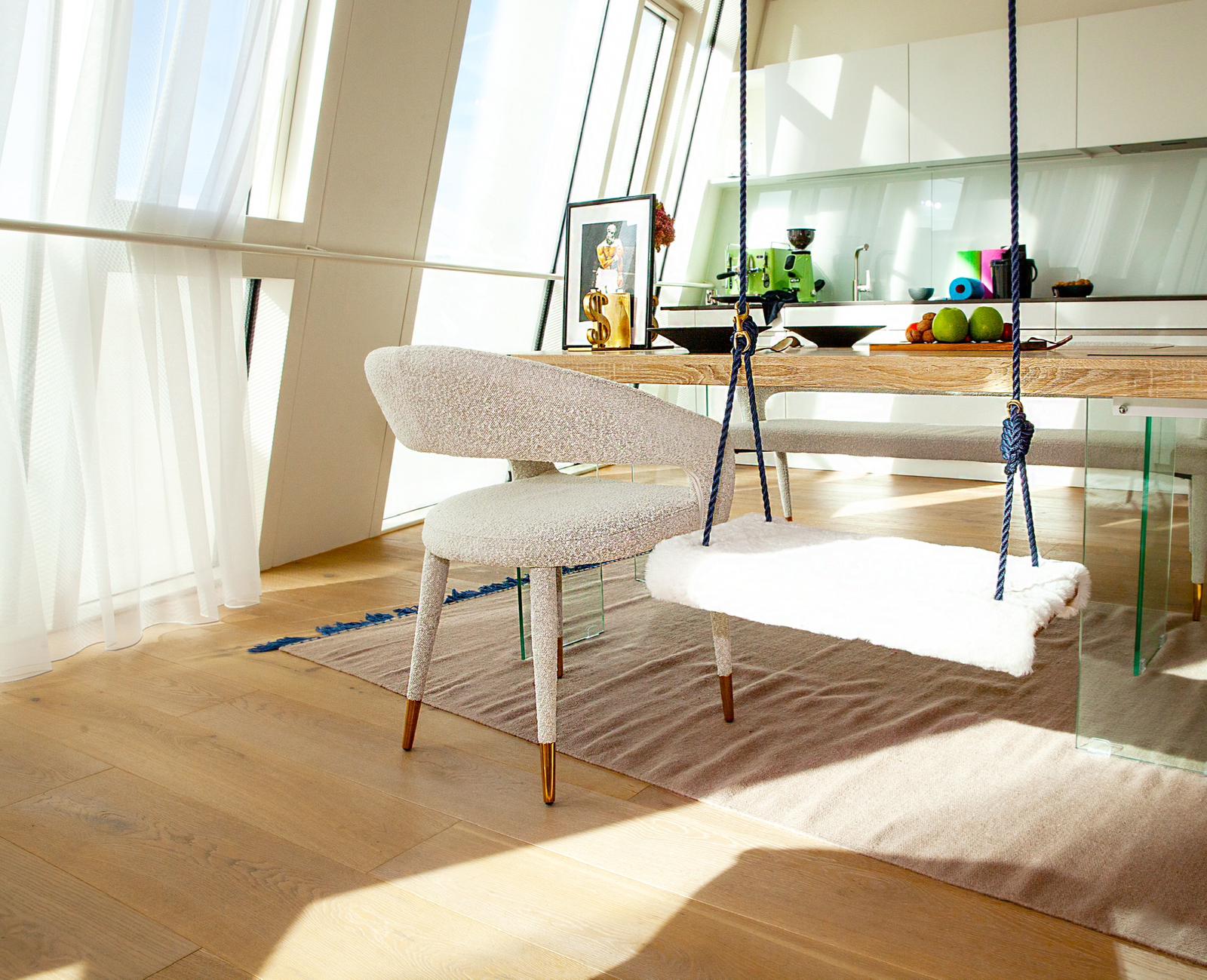 Masaya eşlik eden salıncak ise mekâna hareket ve eğlenceli bir dokunuş katıyor.