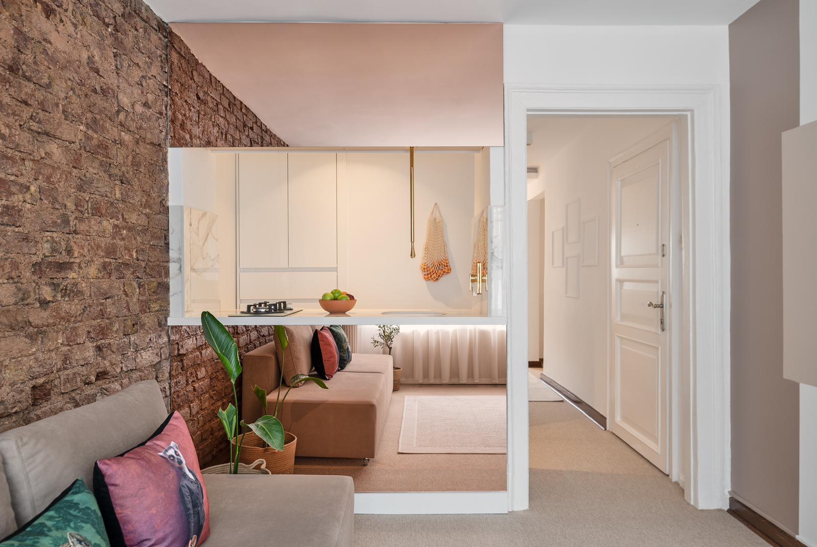 hissettirmek üzerine planlandı. Mutfak, ön kısımdan salona bakacak şekilde konumlandırıldı; pembe ayna ve doğal pirket taşlarla uyumlu tasarım,