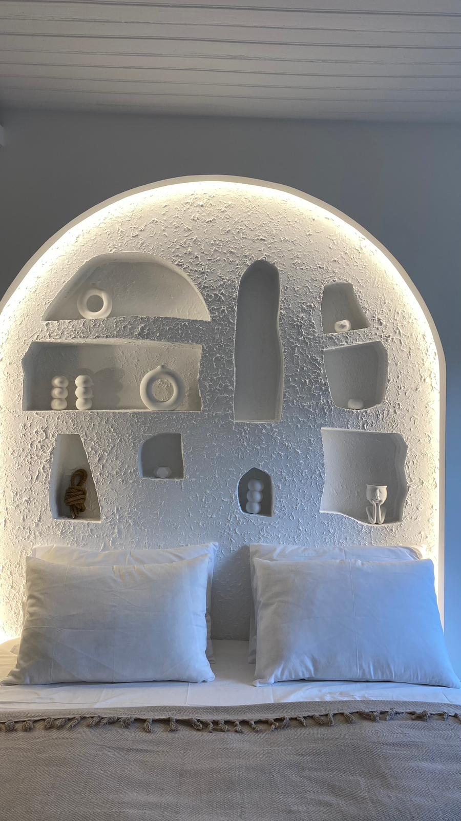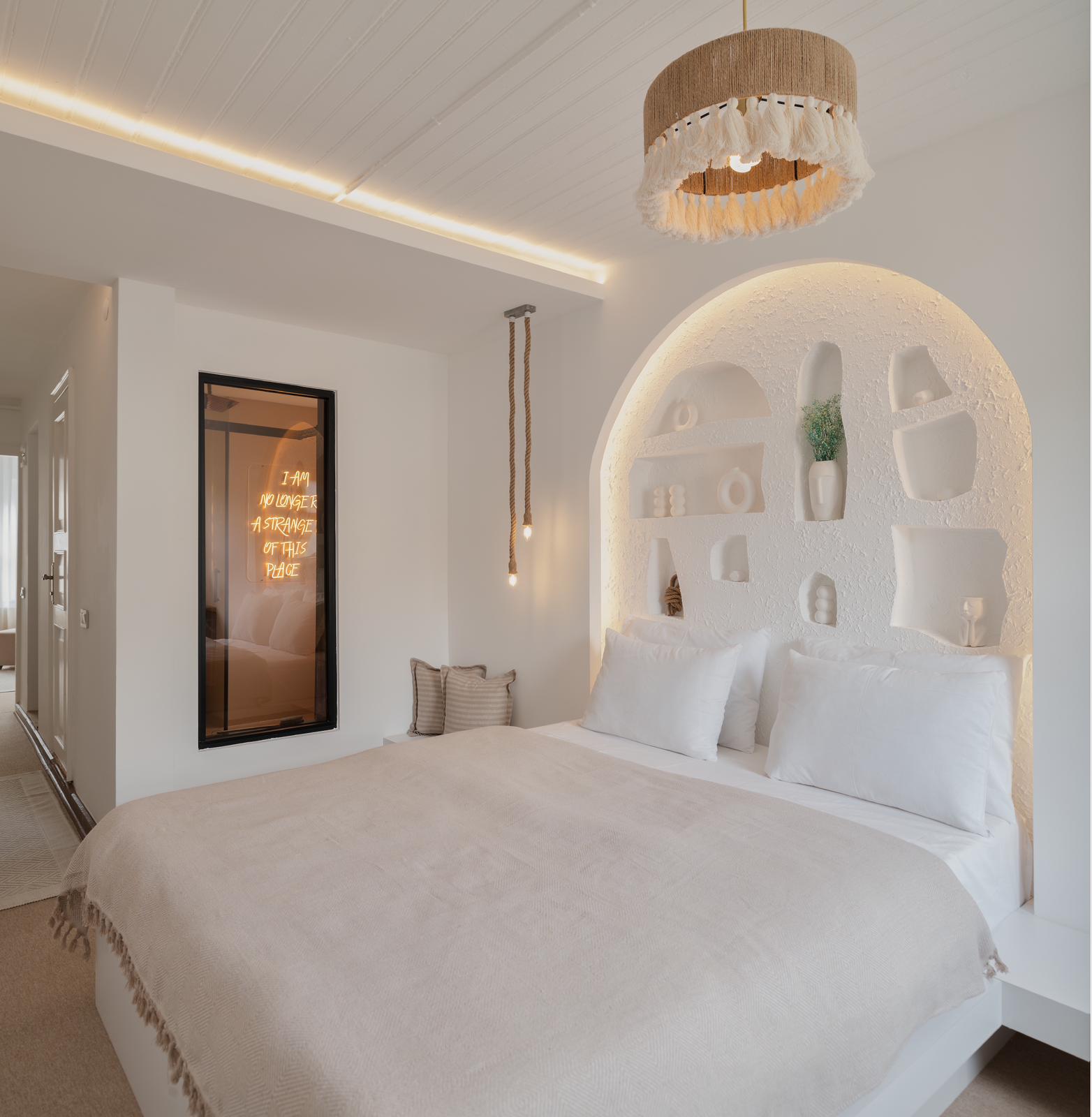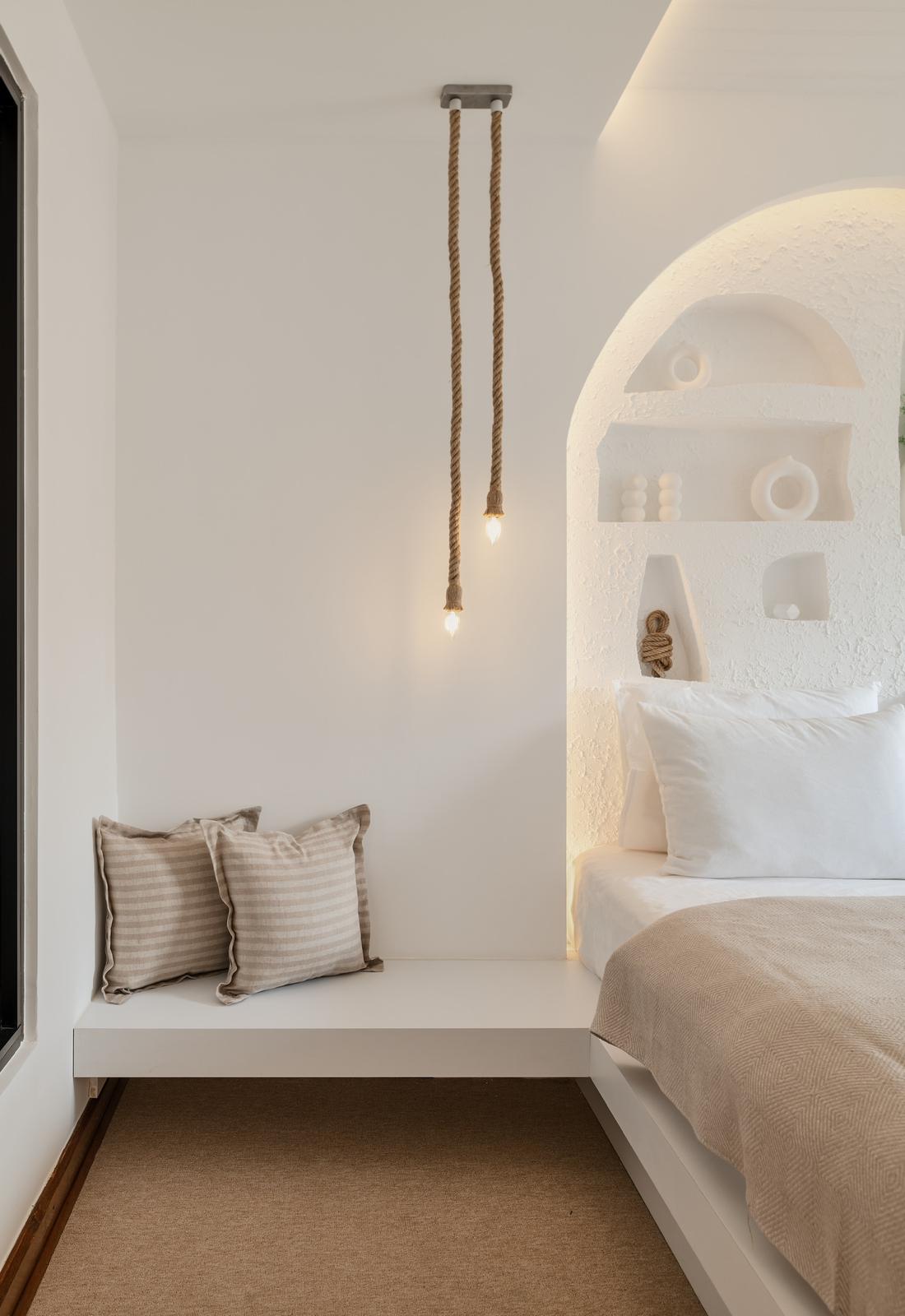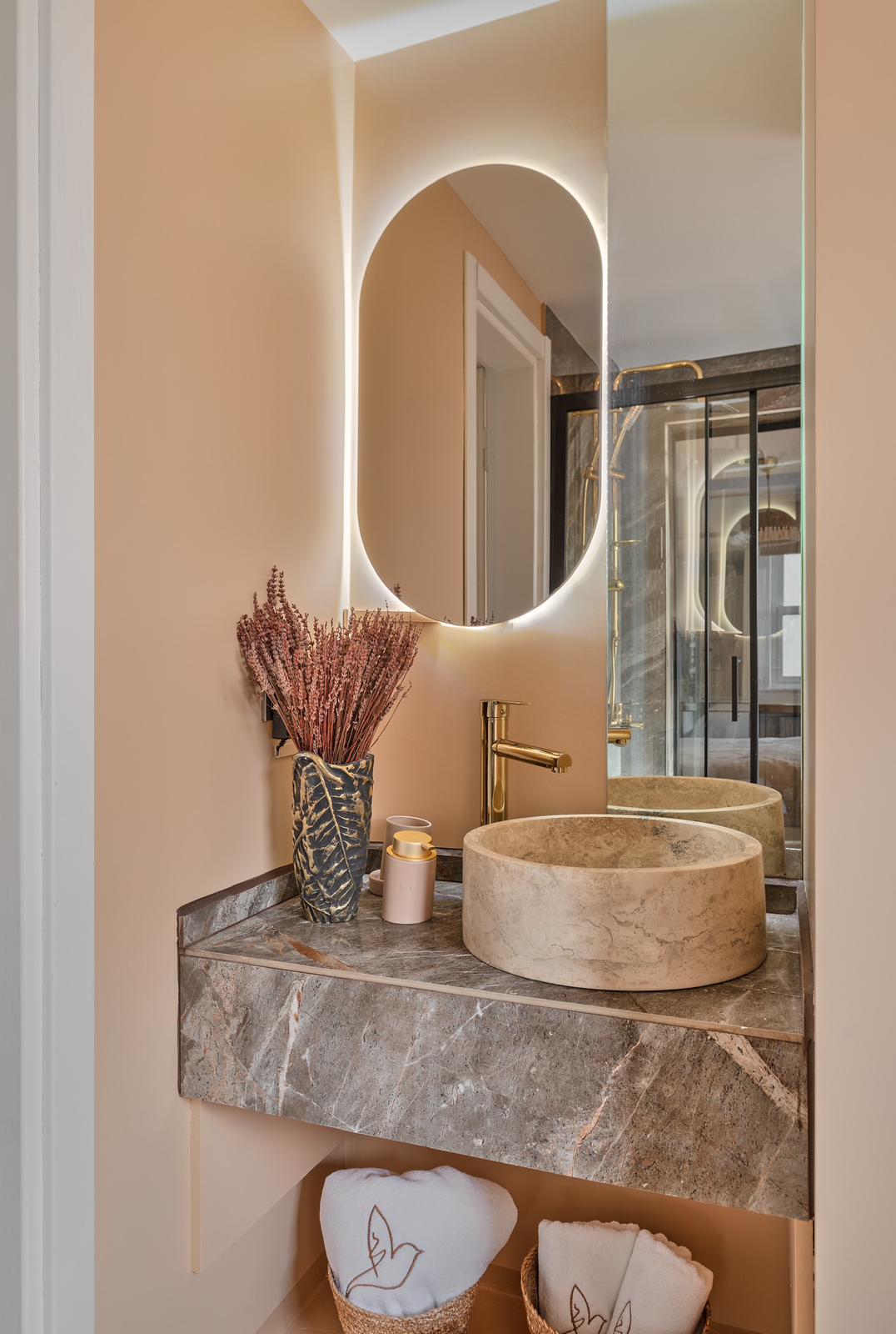 aydınlatmalar, genel ambiyans ve detaylar bütüncül olarak tasarlanırken, özel niş detayı hem başlık hem de işlevsellik sağlıyor. Banyo ise