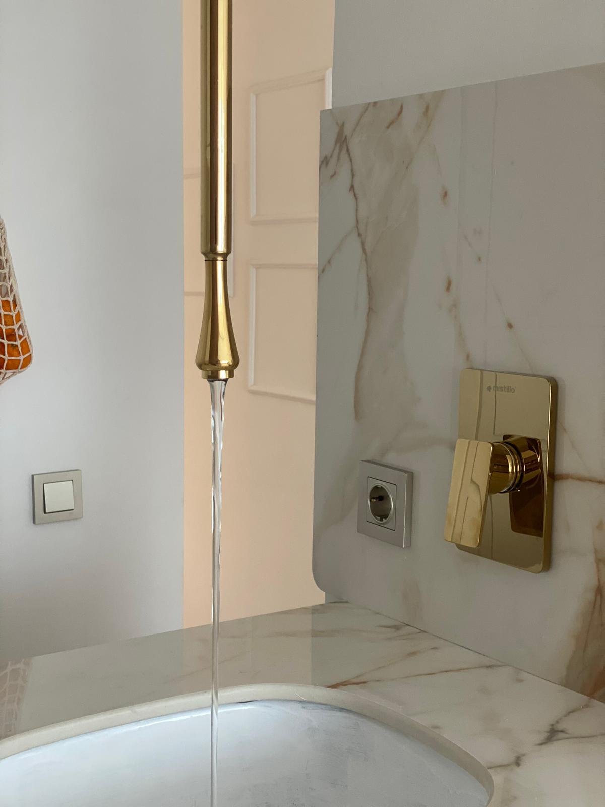 mekânın hem geniş hem de estetik görünmesini sağlarken, tavandan gelen musluk detayı mekâna modern bir dokunuş katıyor.